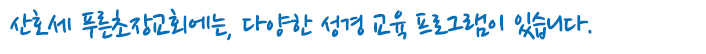 신구약 성경을 구속사적으로 집대성한, 구속사 시리즈는 성경을 좀더 쉽게 그러나 깊게 깨달을 수 있도록 도와주는 귀한 길라잡이입니다. 주일 예배후 진행되는 성경공부와 매월 드리는 구역 예배는 성경을 구속사적관점으로 배울 수 있는 좋은 시간으로 올바른 신앙관을 정립하는데 큰 도움이 되고 있습니다.